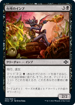 特に特徴的なのが、《血管の施し/Alms of the Vein》と《吸血鬼の口づけ/Vampire’s Kiss》といったドレイン呪文、そして実質1マナ2/2速攻飛行の《台所のインプ/Kitchen Imp》ですね。