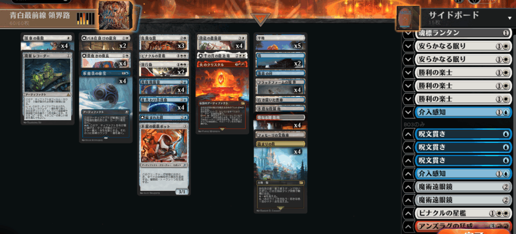 - 【赤単】は数を減らしたが、アグロ全体は減っていないため、メインの《領事の権限》は継続でOK。特に【シミックアグロ】には警戒が必要。