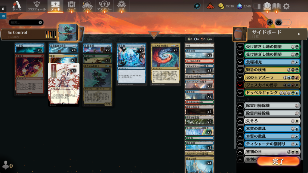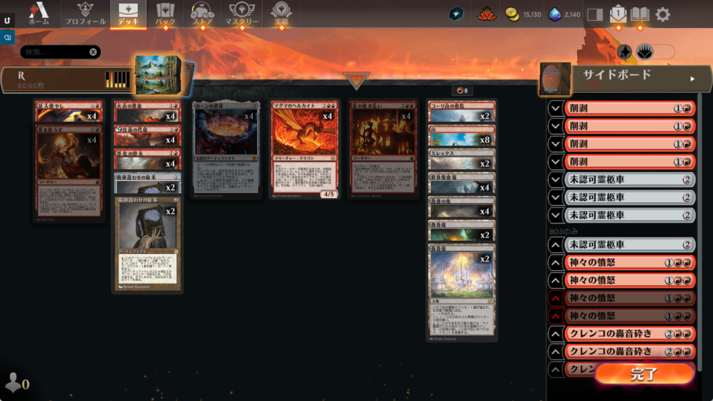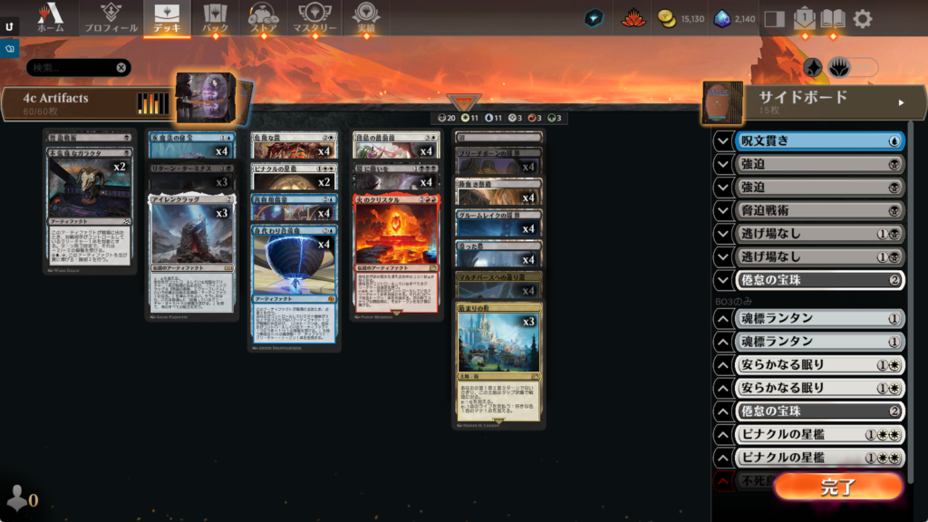 広大なカードプールのおかげで土地基盤が非常に安定している点。さらにアグロ対策がメインから厚めに取られており、環境の高速デッキに対しても実戦的に戦える調整になっています。