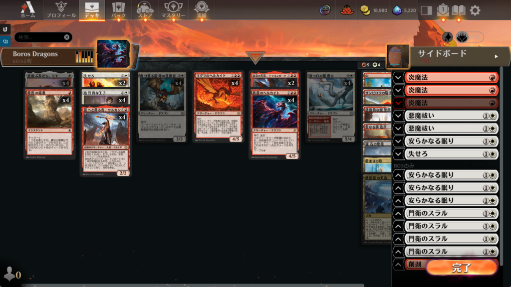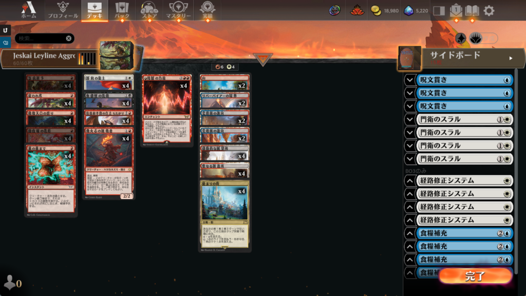 見た目はほぼボロス、でも分類はジェスカイ。アグロ寄りの構成ですが、サイドボードに《食糧補充》が採用されているのがかなり珍しいポイント。