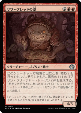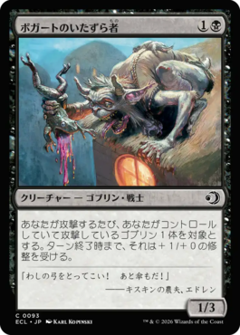 《ボガートのいたずら者》はゴブリンの癖に攻撃時は2/3で殴れるし、通常時でも1/3とタフネスがデカイ。特にタフネスがデカイのが優秀で、枯朽2でも落ちないボディが2マナで設置できる。また、能力も本人は殴らなくていいのが強み。コモンにしてはかなりのやり手だと思います。