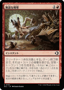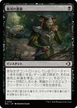 ただ、除去があまりにも貧弱で《焼きつけ》1枚のみで残り4枚はバットリの《無謀な略奪》《傷刃の悪意》をそれぞれ2枚とレアが引けなきゃ負けの構成。