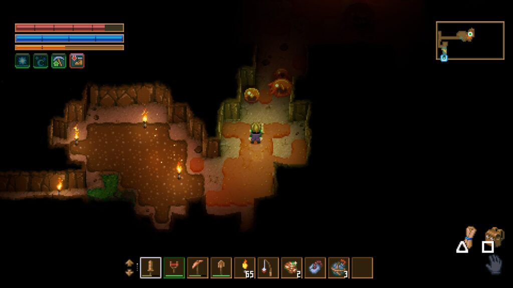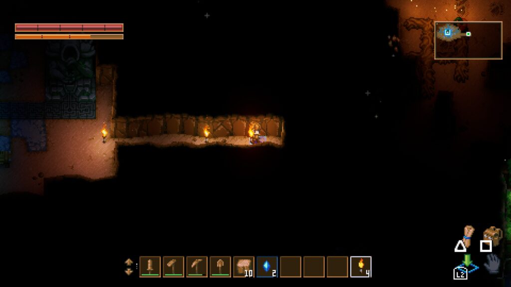 洞窟なので画面は薄暗く、松明は必須。通路もないので自分で掘るしかありません。