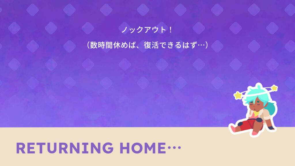 するとやっぱり駄目だったみたいで、回復するまで拠点で休みなと言われることに。仕方ないね。