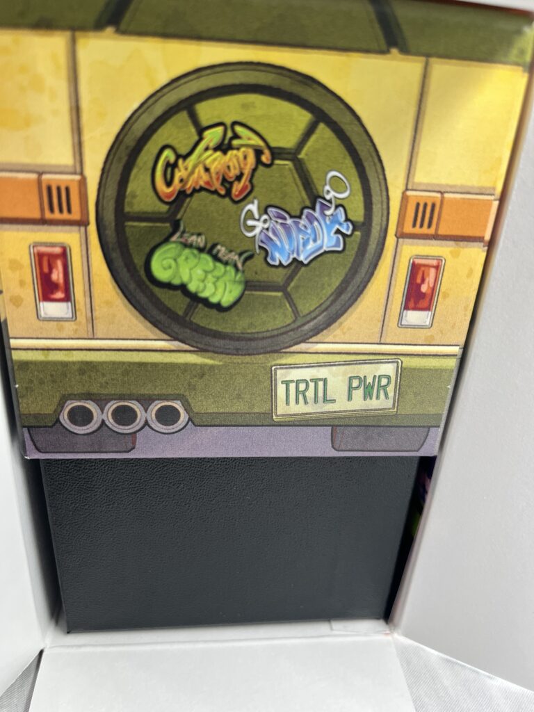 いわゆるタートルズのワゴン車モチーフになっていて、こういう細かい演出はファンにはうれしいポイントです。外箱だけで終わらず、中までコラボの世界観を作ってくれているのはかなり好印象でした。