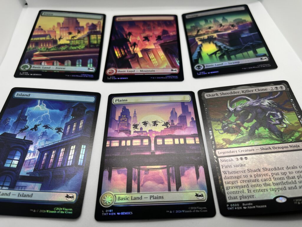 どの土地も色ごとに雰囲気が違っていて、EDHやカジュアルデッキで使いたくなるデザインでした。ピザ土地に関してはコレブーからですのでご注意を。こちらのタートルズメンバーの土地もいいけどね。