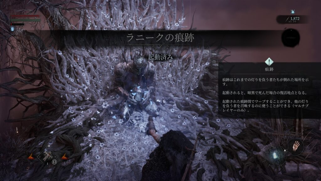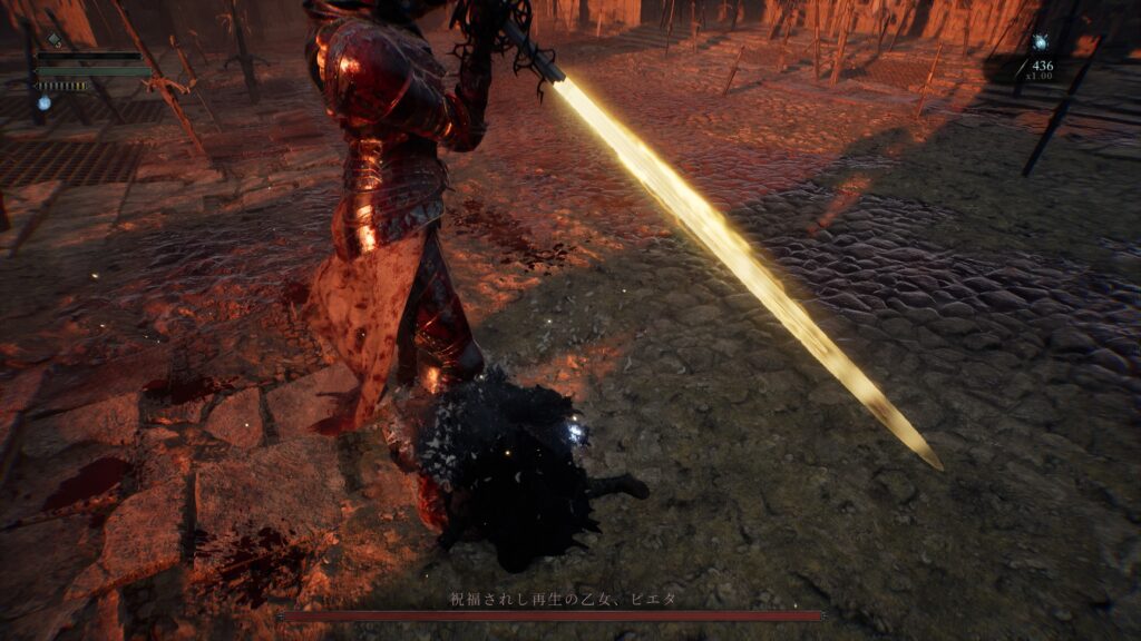 通常のソウルライクだとここで終了ですが、本作はもう一回チャンスがあるのはありがたいですね。実質HPは1.5倍といったところでしょうか。