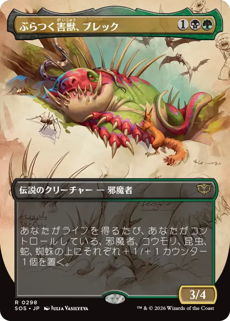 《ぶらつく害獣、ブレック》は単体で爆発力のある統率者ではありませんが、小型クリーチャーを展開しながら継続的に強化していく「育てる統率者」として非常に面白い性能を持っています。