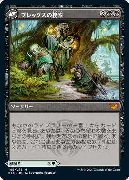 あなたのライブラリーの一番上からカード5枚を見る。あなたは、そのうち望む枚数をあなたの手札に加え、残りをあなたの墓地に置く。あなたは、これによりあなたがあなたの手札に加えたカード1枚につき3点のライフを失う。