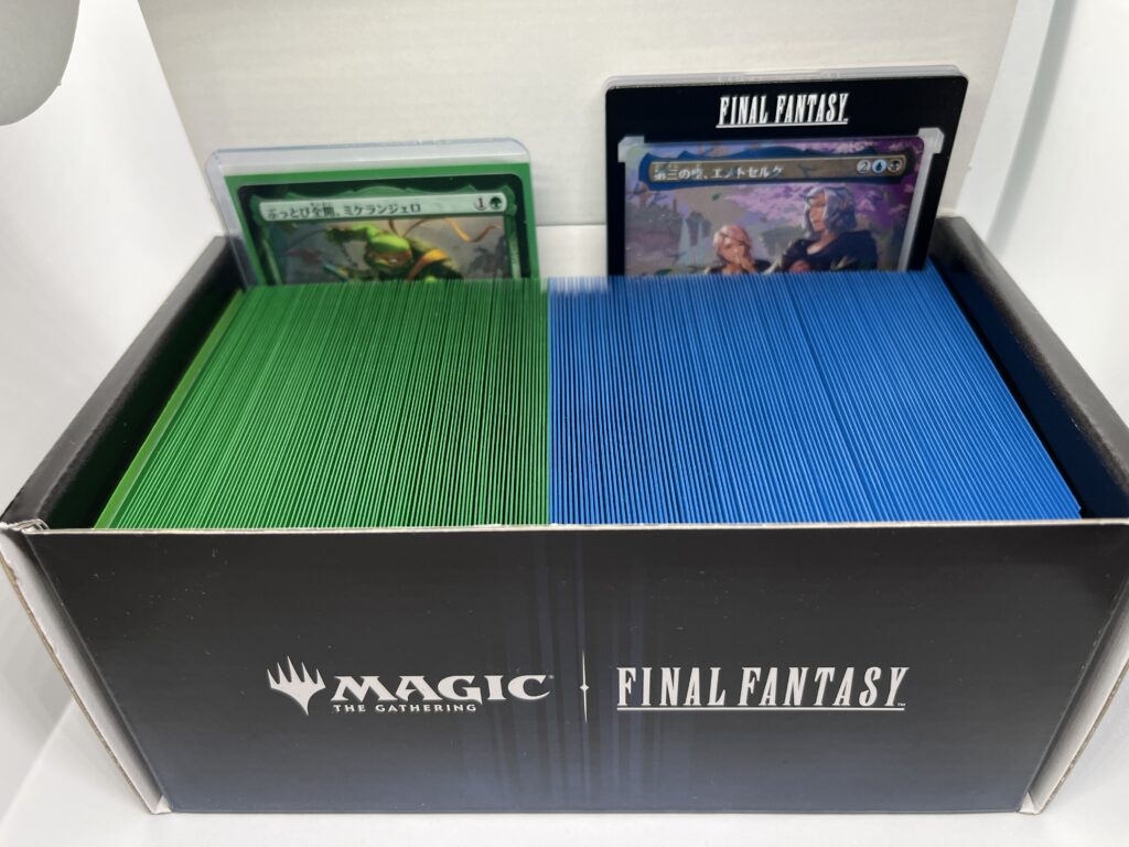 二重スリーブの構築デッキ(メイン+サイド込みで75枚+トークンカード数枚)でギリギリなので、統率者デッキを入れるのは難しいです。